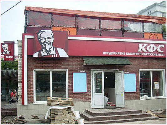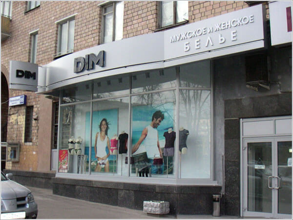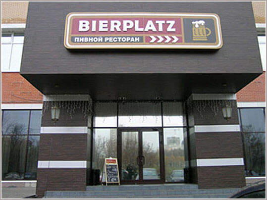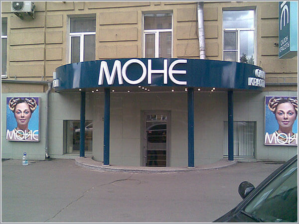 вывески различного вида и технологии изготовления с креплением на фасады, как правило с подсветкой; в регионах больше степень свободы по видам, размерам и конфигурации, т. к. в Москве все параметры строго регламентированы и привязаны к концепции оформления фасада;